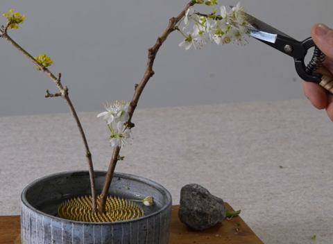 Go the whole way with the discipline of the traditional ikebana schools - Ohara, Ikenobo etc, or head off-piste and do your own thing. The spiky bases hold woody and green stalks, in any position you want. Make criss-cross cuts into the bottom of larger twigs, to stick them in more easily. Lower into water in saucers or dishes, and top up daily.